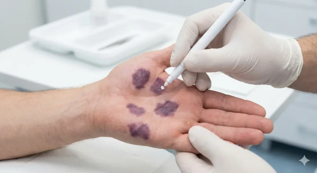 مرحله ۱: تست ید-نشاسته (Minor Test) ما چشمبسته تزریق نمیکنیم. ابتدا محلول ید را به کف دست شما میمالیم و سپس پودر نشاسته روی آن میپاشیم. مناطقی که بیشترین تعریق را دارند، به سرعت به رنگ “بنفش تیره” یا “سیاه” در میآیند. این کار باعث میشود ما دقیقاً بدانیم کجا باید تزریق کنیم تا بیشترین بازدهی را بگیریم و مواد را هدر ندهیم. این “نقشه گنج” درمان ماست.